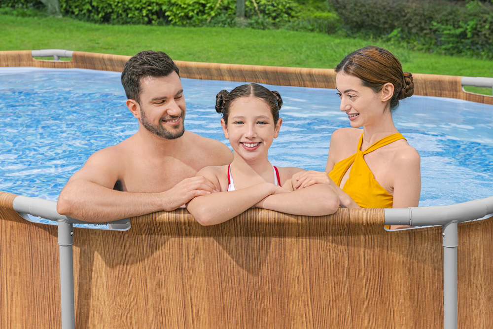Oválný bazén Bestway Power Steel 6,1 x 3,66 x 1,22 m, 2 trysky Comfort Jet™, designový potisk. Sada: bazén, kartušová filtrace, schůdky.