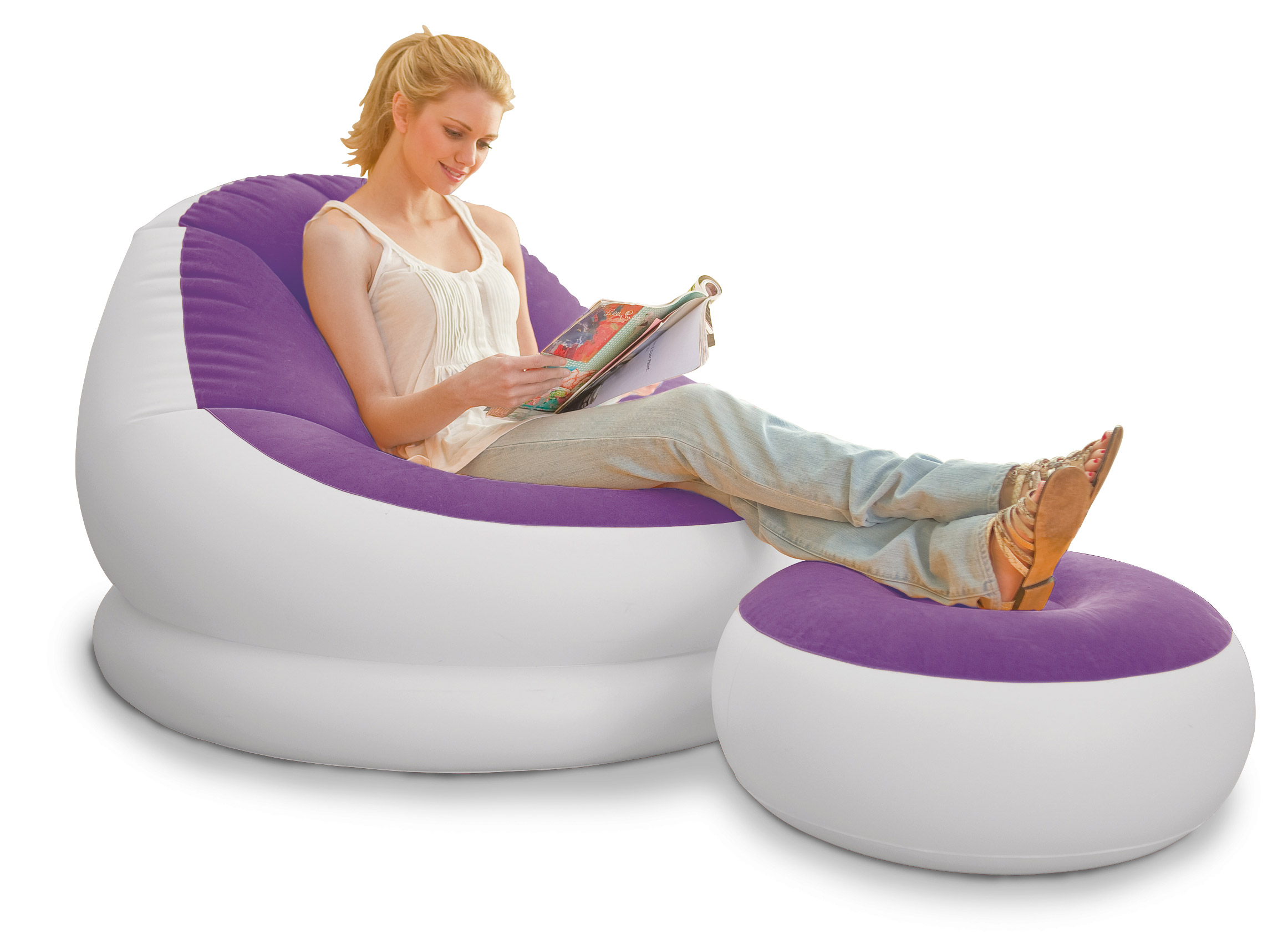 Nafukovací křeslo s podnožkou v jasných barvách do každého moderního interiéru.